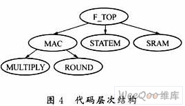 按照上述设计思想,用Verilog对系统进行RTL描述,代码层次结构如图4所示,其中,F—TOP为顶层wrapper模块,连接MAC、STATEM、SRAM三个子模块。MAC实现图3中虚线所示的Booth乘加器,得到的乘积为32 bits数,然后经过舍入调整(rounding)将其转化为16 bits数;STATEM模块实现上文提到的控制流程;SRAM模块由系数SRAM和数据SRAM(存放X(k)、Y(k))组成,分别对应图3的MEM1、MEM2,为了方便后面的验证,直接调用Xilinx的SRAM单元RAMB4—S8—S8。