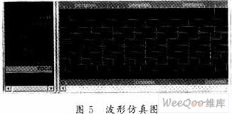 代码使用synopsys VCS进行仿真,通过debussy的PLI接口生成fsdb波形文件。在debussy中对波形(图5所示是波形仿真图)进行分析。当前的配置寄存器的值为0x0000018f,为三阶IIR滤波器。READ—EN为读使能信号,低电平有效。STATE—WE—LOC为写使能信号,低电平有效。RADDR—LOC和WADDR—LOC是存储单元的地址,地址范围从0到5,与三阶IIR滤波器对应;当WADDR—LOC为5时,写入的是X(k),下一时钟周期变为2,写入Y(k)(标尺线所对的值0x000a,已经过rounding处理)。XIN—LOC和YIN—LOC是MAC的输入数据。STATE—LOC和YIN—LOC是MAC的输入数据。CUR—STATE为状态机的状态变化,可以看出,与前面的状态含义和状态机实现策略一致。这里,读写地址在整个运算过程中都占用两个时钟周期是为了保证MAC运算的正确完成,当X(k)和计算所得的Y(k)写回时,不涉及MAC运算,因此,只分配一个时钟周期。