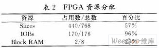 为了确保滤波器以及整个控制系统设计的正确性,我们选用Xilinx Spartan2的XC2S50系列做FPGA验证。首先,在synplify中生成网表文件(edf),然后,通过Xilinx ISE生成带延时信息的单元网表文件(v)和线延时文件(sdf),用于在VCS中进行后仿真,最后生成FPGA下载文件(bit)。XC2S50硬件占用情况如表2所示。表2所示是FPGA资源分配表。