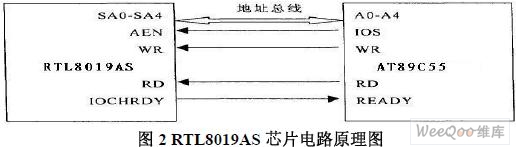 用作以太网控制芯片RTL8019AS 的复位信号输入端,P1. 1, P1. 2 分别模拟IZC 总线用作EEPROM 数据存储器的时钟信号和数据输入输出线。引脚12(INTO)用来对以太网控制器RTL8019AS 的中断请求作响应。