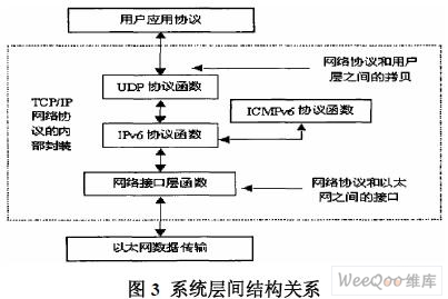 在网络化数据采集系统的设计中,底层网络数据的收发采用的是以太网为物理媒介,在Internet 的通明传输中采用的是TCP/IPv6 为通信协议来搭建的。系统在测控的局域网中,通过使用一台路由器来实现与外部Internet 的连接。这样做,一来保证了内部测量仪器、传感器等电子设备的安全性,对外部的访问可以进行过滤,防止了来自因特网的恶意破坏;二来,在网络通讯中的许多繁杂的工作不需要在现场设备端实现,现场设备的TCP/IPv6 协议栈设计的工作量可大大降低。一般只要实现基本的IPv6, ICMPv6 和UDP 就可以工作了。
