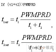 当根据逆变器单独输出零矢量O000和O111时,电动机的定子磁链矢量ψ是不动的。根据这个特点,在TPWM期间插入零矢量作用的时间t0,使TPWM=t0+t1+t2。其中t0为零矢量导通的时间,t1、t2分别为合成目的矢量相邻60°定子矢量的作用时间。当计算的饱和时,也即t1+t2>TPWM时,软件实现如下: