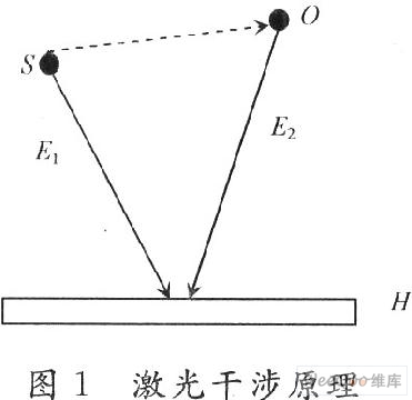 光源S处发出的频率为f、波长为λ的激光束一部分投射到记录介质H(比如全息干板)上,光波的复振幅记为E1,另一部分经物体O表面反射后投射到记录介质H上,光波的复振幅记为E2。其中: