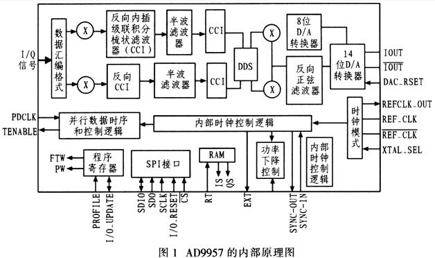 AD9957支持高达400 MHz输出的QDUC,内部集成有高速DDS、14 bit D/A转换器、时钟倍频电路和数字滤波器。通过一个公用系统时钟在器件内部同步独立的通道,AD9957可对由于模拟处理(例如滤波、放大)或PCB布线失配而产生的外部信号通道的不均衡进行有效的校正。AD9957的内部结构如图1所示。它由并行数据时序和控制逻辑、程序寄存器、反向正弦滤波器、内插级联积分梳状滤波器、内部时钟控制逻辑A/D转换器、数据寄存器和SPI串行通信接口控制器等组成。图中Cs为器件的片选信号输入端,低电平有效。SDIO为双向引脚,和SDO引脚一起用于串行操作的数据输入和输出。SCLK为I/O串行操作时钟输入端,在该端的上升沿写入数据,下降沿读出数据。IOUT为输出引脚,有一个互补输出端,使用时需接电阻至数字地。