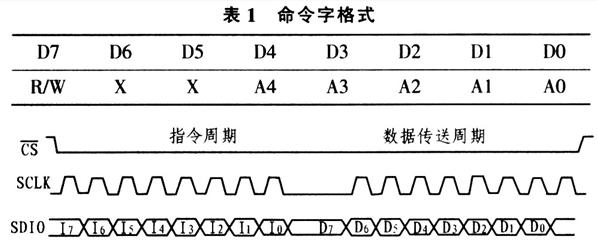 AD9957具有SPI串行通信接口,极易实现与单片机的通信。SPI通信是通过SDIO、SDO、CS和SCLK等引脚实现的。为能正确传送数据到AD9957的数据寄存器,需严格遵循通信命令格式及时序要求。表1为读取寄存器命令格式。命令序列由8位二进制数组成,第1位为读/写控制位,为“1”则读取寄存器数据,为“0”则向寄存器中写入数据;中间两位为无关位:最后5位为寄存器选择位,DO~D4分别对应寄存器A0~A4。图2说明向AD9957写指令或数据的操作时序。