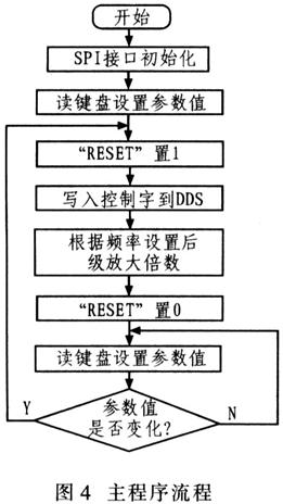 AD9957的软件设计主要完成SPI数据读取及处理工作,采用汇编语言编写,程序流程如图4所示。首先将频率写入AD9957中,再将不同的相位写入其中,使AD9957产生频率相同、相位不同的I/Q信号,在写入过程中,将“RESET”置“1”,使AD9957不输出信号;当控制字全部写入后,调整后级放大器的倍数。同时将“RESET”置“0”,使AD9957开始工作,当频率变化时,幅度保持不变。