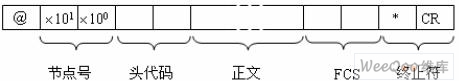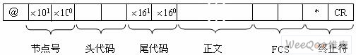 发送命令必须以@打头,节点号指出与上位机通讯的PLC,头代码为两字符命令代码,正文设置命令数据,FCS 为组检验序列,终止符固定设定为*与↙。
