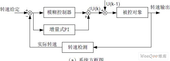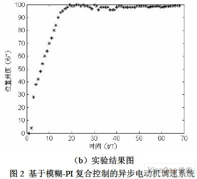 同时考虑到模糊控制器是一个有误差控制器,达到期望速度后的稳态阶段波动比较大。而采用PI控制, 当误差较小时有较高的稳态精度。故而把增量式PI控制策略引入模糊控制器,构成模糊-PI复合控制,以 改善模糊控制器的稳态性能。基于模糊-PI复合控制的异步电动机调速系统如图2(a)所示,实验结果如图 2(b)所示(给定转速100 r/min,采样周期T=150ms,转速误差≤1.0 r/min)。
