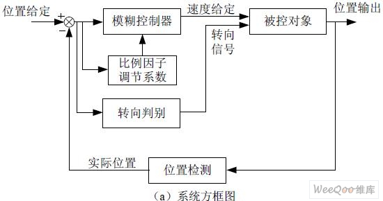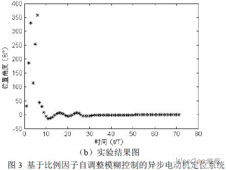 基于比例因子自调整的模糊控制系统如图 3(a)所示,实验结果如图3(b)所示(电机额定转速运 行时定位于0°,采样周期T=150ms,位置误差≤0.09°,即1 个计数脉冲的位置间隔)。