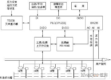 该系统由四台大泵(22KW)与一台小泵(5.5KW)组成;PLC部分由西门子可编程控制器S7-200系列的CPU226,文本显示器TD200组成;变频器采用三菱FR-A540系列,功率22KW。