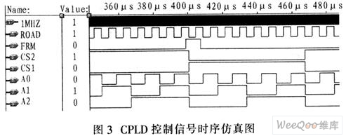 EPM7128SLC是一款Ahera公司生产的CPLD,其容量为128个宏单元,采用硬件描述语言VHDL对CPLD编程设置实现信号的选通控制。首先编写分频器模块对1 MHz晶体振荡器进行20分频,输出2路相位相错、周期为20 μs的矩形同步信号。其中一路信号经D触发器进行2分频,得到占空比50%、周期为40μs的方波信号;然后编写信号选通控制模块。此模块根据方波信号和另一路同步信号循环输出控制信号,两模块都在MuxPlus-II环境下开发,CPLD控制信号时序仿真结果如图3所示,其中,信号FRM和ROAD是单片机主程序运行的勤务信号;CS1和CS2是2片ADG508A的片选信号:A0、A1和A2则是ADG508A通道选通控制信号。