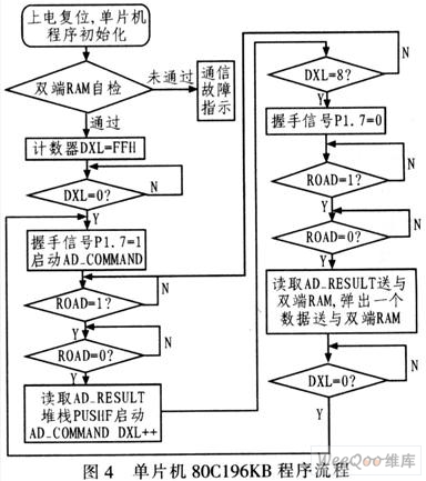 80C196KB通过判断ROAD信号在其上升沿读取上次A/D转换结果,同时启动A/D转换器转换下一路信号,该单片机用FRM信号作为非屏蔽中断使计数器DXL归零,主程序循环一次,保证对16路通道信号的时分复用采集。单片机80C196KB程序流程如图4所示。