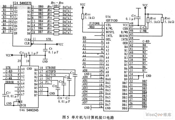 为达到采集数据的实时可控性,系统设计双机通信接口作为单片机A/D转换数据向计算机传输的通道。计算机采用WDM下的EPP模式通信,速度达500 KB/s~2 MB/s。使用双端口RAM IDT7130作为主要元件,通过通信接口,单片机将A/D转换数据存入双端口RAM中,计算机则实时显示从双端口RAM中读取的数据。单片机通过双端口RAM IDT7130的A端口进行写操作,计算机则通过B端口进行读操作。握手信号由单片机通过对ROAD信号计数产生,二者可异步读写操作,实现数据交换。图5为单片机与计算机接口电路。
