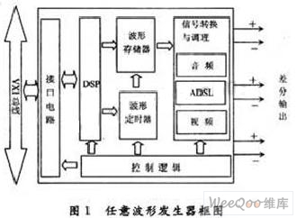 任意波形发生器如图1所示,可以以单端和差分模式工作,具有完整的波形发生能力,可以产生可修改的复杂波形,具有激励被测器件所需的定时功能。 AWG作为VXI仪器系统的一个模块,通过标准化的接口模块与资源控制器通信,当需要产生激励波形时,资源控制器发送命令和参数到AWG模块,AWG模块采用高速DSP芯片作为主处理器,DSP与波形定时器和控制逻辑一起完成任意波形的产生,从而提供给被测器件(DUT)所需的激励波形。由于被测芯片种类繁多,频带范围很宽,对于不同的被测芯片,采用的定时器和控制逻辑都不尽相同,而且,随着电子技术的发展,频率合成技术已经广泛应用到测试测量领域,采用数字频率合成(DDS)专用芯片使得电路更加简洁可靠,因此,任意波形发生器的设计也更加容易,其抗干扰能力和精度都更加容易保证。