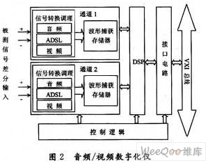 音频/视频数字化仪如图2所示,主要由信号转换和调理电路、波形存储器、DSP、控制逻辑和接口电路等组成。AVD可以设计多个通道,每个通道拥有独立的硬件资源,可以捕获各种频带的被测信号。同样,AVD也是一个标准化的VXI仪器模块,也在资源控制器的控制下与AWG及其他模块一起完成测试任务。AVD模块中包含一个高速DSP芯片作为核心处理器,一方面,DSP中植入了大量的信号处理库函数,诸如FFT、数字滤波器等任务都可在DSP中完成;另一方面,一些测试算法也可以移植到DSP中来做,因此,在AVD模块内部就可以得到一些测试数据的中间结果,使得传送到主机的数据量大大减少,VXI总线上的数据被大量分流,同时,主机的计算量也被DSP芯片分担,这对于缩短测试时间有重要作用。在对大规模混合信号芯片进行多片并测时,采用多片DSP并行的结构,在AVD模块内部完成大量的信号处理和测试算法,能更加显著地提高测试效率。