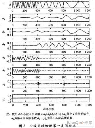 图1中信号的不连续是由予低频特征的正弦信号在后半部分突然有高频特征的正弦信号加入,首先利用傅里叶变换对信号在频城进行分析,发现无法检测信号的间断点,这是由于傅里叶变换不具有时间分辨力。接着利用小波分析进行分析,如图3所示,使用db6小渡将信号进行6层分解,以检测第一种类型的间断点,可以非常清楚地观察到信号的不连续点,即高频特征的正弦信号的加入点,这是因为间断点包含了高频信息。如果只需要识别检测第一种类型的间断点,可以非常清楚地观察到信号的不连续点,即高频特征的正弦信号的加入点,这是因为间断点包含了商频信息。如果只需要识别信号的不连续点,用dbl小波比db6小波效果要好。
