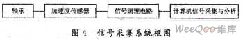 试验对象是某齿轮减速箱的406滚动轴承,试验通过研磨滚动轴承内圈来模拟轴承内圈的磨损故障,以不同的配合间隙模拟故障的严重程度。测试转速1 480 r/min,采样频率确定10 kHz是完全能够满足测试要求的,整个试验在减速箱试验台架上进行,信号采集系统框图如图4所示。
