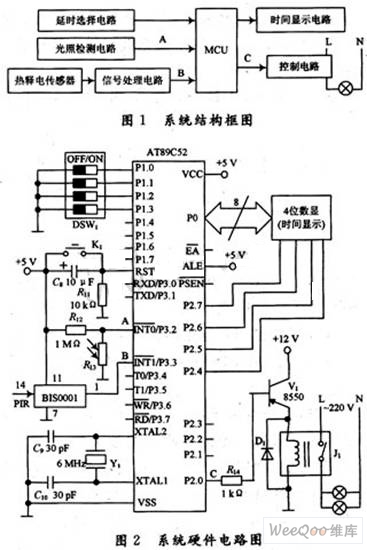 系统结构图如图1所示。本系统主要由光照检测电路、热释电红外线传感器及处理电路、单片机系统及控制电路组成。工作时,光照检测电路和热释电红外线传感器采集光照强弱、室人是否有人等信息送到单片机,单片机根据这些信息通过控制电路对照明设备进行开关操作,从而实现照明控制,以达到节能的目的。