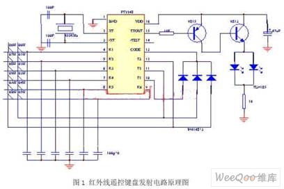 由集成芯片PT2248构成的红外线遥控键盘发射电路见图1。00H"09H为数字键,0AH为复位键,0BH为取消键。