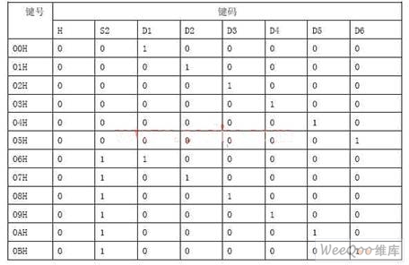 C1,C2,C3是用户码,在T1,T2,T3与CODE之间分别接二极管则分别代表C1,C2,C3为高电平“1”,不接二极管则代表低电平“0”,图2中C1C2C2=111。D1,D2,D3,D4,D5,D6是发送的数据码,键号与键码的对应关系见表2。