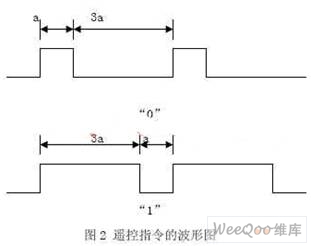 PT2248遥控指令的波形正脉冲的占空比为1/4时代表“0”,正脉冲的占空比为3/4时代表“1”见图2。