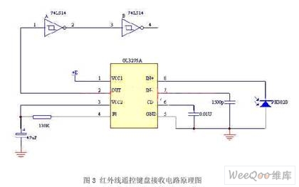 无论“0”还是“1”,发射时正脉冲被调制在38KHZ的载波上,载波的占空比为1/3,这样有利于减少功耗。每个发送周期按C1,C1,C2,H,S1,S2,D1,D2,D3,D4,D5,D6的次序串行发送,总长度为48a,其中a为每位码周期的1/4,其大小为:a=192/fosc秒=192/455KHE=0.422ms。按下00H"0BH中某个键时,输出脚TXOUT发送两个周期的12位码,其间隔为80a。由GL3276A构成的红外线遥控键盘接收电路见图3。