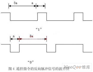 当红外线线遥控键盘接收电路工作时,接收管PH302B接收到带有载频为38KHZ的遥控指令的红外线信号后,进行放大,限幅和检波,检出遥控指令的脉冲包络,滤去38KHZ载频,得到遥控指令的脉冲信号,整形并反向后由OUT输出,将GL3276A的OUT经74LS14施密特触发器整形,最终得到遥控指令的理想的反向脉冲信号。得到的遥控指令的反向脉冲信号的波形正脉冲的占空比为1/4代表“1”,正脉冲的占空比为3/4代表“0”,见图4。
