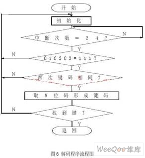 遥控键盘的可靠性是软硬件设计中重点考虑的问题。在硬件上,将GL3276A的OUT经74LS14施密特整形,以提高抗干扰能力。在软件上要正确的解码,必须从每位码的起始位开始接收,本设计中,PT2248发送的遥控指令的起始码为用户码C1C2C3=111,因为P3.2接收到的“1”由‘低低低高’组成,因此接收到的码应为三个“0001”,若不是,本次接收无效。其次,为了防止接收误码,应对前后两次接收的两个周期的12位串行码进行一致性比较,若相同则与键码表中的键码进行比较,找出相应的键号,否则本次接收无效。解码程序流程图见图6.