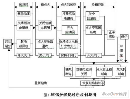 在柴油机动力装置中所采用的锅炉都称为辅锅炉,由于船舶机舱中这类辅助设备很多,因此辅助设备的自动控制是实现“无人值班”机舱的必要条件之一。实现辅锅炉的自动控制就首先要了解其燃烧时序控制,见图1。