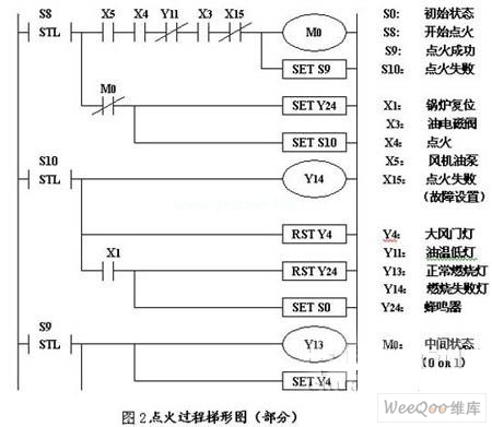 按照锅炉的控制框图我们制定了程序的整体结构,考虑到是模拟器,特别增加故障设置部分,以加强教学功能。我们从思南工控网站下载一个三菱FX2N编程软件,并买了专用数据线,开始着手编写锅炉控制模拟器程序。程序初稿出来后,经过逐段逐句的反复推敲、调试才全部输入PLC作最后的测试,相应的硬件和接线也在同期完成。最终程序由358句、719行构成。例如图2提供的是点火过程部分的一段梯形图。模拟器的形状是落地柜式,外壳是用薄金属板弯制焊接成型并经静电喷塑处理(蛋青色),上半部分为指示灯、蜂鸣器和仪表,中间斜面突出部分是控制面板(分三个部分,见后面说明)。