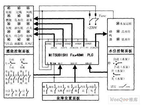 图3是锅炉控制模拟器的系统示意图,面板主要由燃烧控制、水位控制和故障设置三部分组成,布局比较简洁直观。我院设有锅炉实验室,有一套经过改装的日产旧锅炉供教学使用,但就教学、科研而言,真实设备也有其明显的不足之处,如频繁起动容易损坏、使用费用高和许多故障不能再现等等,模拟器正是弥补了这些缺陷。