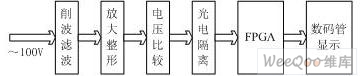 采用电压互感器取来自于发电机组端电压或电网电压的测频输入信号,经削波、滤波处理后,变成幅度基本不变的稳定波形,经放大电路将信号放大整形,再用电压比较电路将具有正负幅值的方波变成只有正幅值的方波信号。然后,通过光电耦合器使FPGA的数字系统与输入信号隔离。FPGA数字系统利用标准的1HZ信号对隔离后的方波信号的脉冲个数进行计数,得到信号的频率数,该频率数经数码管显示。由于发电机组的频率与发电机组端电压有关系,可以从频率的变化得到发电机组端电压的变化。从系统总体框图如图1所示,从中可以看出,该FPGA数字系统与输入通道隔离,因而大大提高了系统硬件的抗干扰能力。
