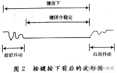 键盘主要完成向系统输入数据,传送命令等功能。它是一个机械弹性按键开关的集合,利用机械触点的合、断作用产生高、低电平。通过对电平高低状态的检测,以确认按键按下与否。一个电压信号通过机械触点的断开、闭合过程的波形如图2所示。
