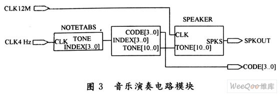 根据声乐学知识,组成乐曲的每个音符的发音频率值及其持续的时间是乐曲能连续演奏所需的两个基本要素。获得这两个要素所对应的数值以及通过纯硬件的手段来利用这些数值实现所希望乐曲的演奏效果是关键。如图3所示,该电路需要由NOTETABS(音调发生器)、TONETABA、SPEAKER(数控分频器)三个模块组成,分别实现了声音产生、节拍控制、音调控制的功能。