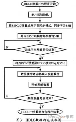 Z85C30有两个通道,每个通道可以发送,也可以接收数据。由于数据的拆包只是数据打包的逆过程,并且Z85C30也支持HDLC帧数据的拆包,所以,在此只介绍如何进行数据打包。将打包的数据发给GMSK调制解调器CMX589,就可以得到很好的GMSK信号,这样,GMSK信号就可以由高频板调制发射出去,以便和其他台站实现通信。本系统的软件流程如图3所示。
