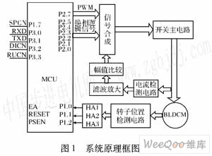 PwM信号的频率由单片机内的寄存器PWMl值确定。PWM信号的占空比由寄存器PwM0的值确定。在单片机的一个A/D转换输入端P1.7引脚输入模拟电压信号SPCIN。该模拟电压经单片机采样转换成的数字量,再送到寄存器PwM0来改变PWM信号的占空比,实现速度调节。
