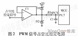 为了提高A/D转换的精度,本文采用了图2所示的PWM信号占空比给定电路。占空比给定信号不是直接接到单片机的P1.7引脚,而是中间经过一个运放电压跟随环节和一个Rc滤波环节。这样的输人电路可以为单片机内AD(:采样电容上的残留电压提供快速放电通道,从而减少其对所输入模拟信号的影响,同时图中的Rc网络还可以滤除输入信号中的高频干扰。图中Dl、D2为5 V稳压管,可防止输入到A/D口的模拟信号大于单片机的工作电压而使单片机芯片损坏。