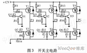 驱动器采用了图3所示的开关主电路。上桥臂功率管Tl、B、_r5为P沟道的MOSFET,下桥臂功率管T2T4、T6为N沟道的MOSFET。