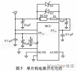 本文选用的单片机分别设置了独立的模拟电源引脚AV。。和数字电源引脚DV。。。为可以防止AVDD被DVDD上的数字信号噪声干扰。本文采用了图5所示的单片机供电电路。AVDD和DVDD之间用一个磁珠串连一个1 n电阻隔开防止干扰,同时再并联两个反方向的肖特基二极管,防止Av。。和DVDD之间电位差过大而使芯片损坏。