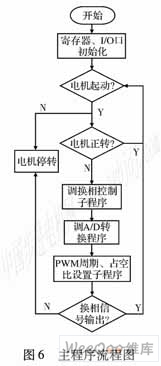 单片机系统软件主要由主程序、换相控制子程序、A/D转换子程序和PwM信号设定子程序组成。主程序流程如图6所示。