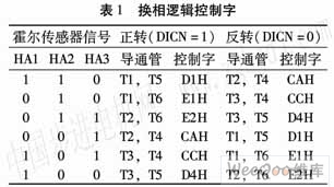(1)换相控制子程序所设计的驱动器用于驱动三相星形联接无刷直流电机,采用二二导通方式,6种导通状态,转子每转60。变换一种状态。单片机通过向P2口送控制的方式实现换相控制。表l是换相控制子程序中的换相控制字(正转和反转)。电机起动后单片机根据从P1.0、P1.1、P1.2引脚采集到电机位置信号HAl、HA2、ItA3,向P2口送相应的控制字进行换相控制。