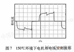 (1)高温运行试验把驱动器放入恒温箱,调节恒温箱温度达到150℃并保持恒温,然后起动电机,电机负载加到额定值,通过改变PwM占空比进行在一定范围内连续调速试验,在连续运行3小时过程中,电机及驱动器运行正常,母线电流值和相电流波形无变化。图7是没有限流和PwM控制时相电流的实测波形。重复以上实验10次,电机及驱动器累计运行30小时,驱动器运行正常,器件完好。