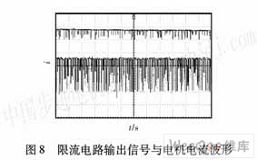 (2)限流试验逐渐增大电机的负载转矩,直到电机电流达到限流电路的设定值,限流电路起作用。图8实测的限流时限流电路输出波形和母线电流波形。上面波形为母线电流波形,下面的波形为限流电路的输出信号波形。可以看出,母线电流被限制在一个恒定值以下,实现了恒功率运行。