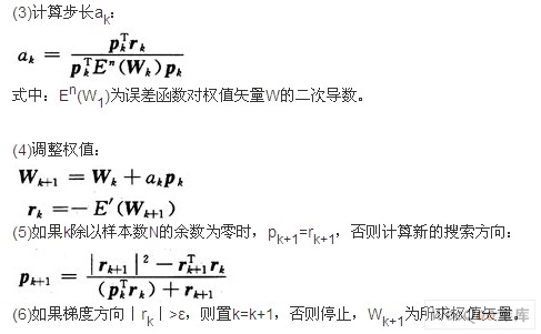 传统的前向多层网络的BP学习算法实质上是无约束的最速下降法,改进的BP算法是对最速下降法作了一些约束;而共轭梯度法则是介于最速下降法和牛顿法之间的一种方法,它仅需要利用一阶导数信息,不仅克服了BP学习算法收敛慢的缺点,又避免了存储和计算牛顿法所需要的二阶导数信息。共轭梯度法的计算步骤和最速下降梯度法差别不大,主要差别在于搜索方向不同,即每一步的方向不是梯度的负方向,而是一种共轭的方向。由原来的负梯度方向加上一个修正项得到共轭方向,也就是使得最速下降法具有共轭性,从而提高算法的有效性和可靠性。共轭梯度法应用于神经网络中的目的是求误差函数E(W)的最小值。算法主要是利用共扼梯度方向来修正权值W,使W的确定更为快速,计算过程如下;