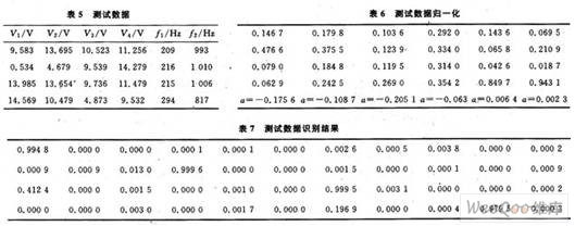 表1为实验测得的故障样本数据;表2为归一化后的数据,其激活函数采用S型函数f=1/(1+e-ax);表3为神经网络的目标输出模式,1表示有故障,0表示正常。