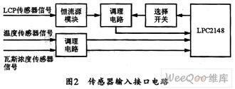数据采集是本系统的关键组成之一。其传感器输入接口如图2所示,它主要由信号类型选择开关、放大电路、滤波电路组成。其中选择开关用于确定输入处理器的信号是LCP传感器输出的速度信号还是加速度信号。
