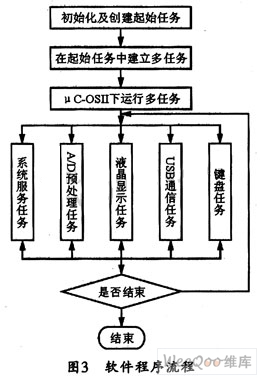 本系统中的各个任务之间,都有数据需要交换,因此,可采用消息机制进行任务间的通信,即通过消息邮箱向各个任务发送消息,依次完成数据的传递。在由μC-OSII管理的多任务机制下的程序流程如图3所示。
