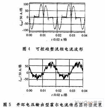 实验分别对开环电压输出型霍尔电流型传感器和闭环电流输出型霍尔电流传感器做比较分析,运行样机,得出以下不同的补偿效果。图4为可控硅整流柜开启时的负载电流Iload,其中横坐标为时间,单位为秒,纵坐标为电流,单位为安培,可以看出该电流含有大量非基波成分,经过专业仪器分析,该电流含有大量的5次和7次谐波,这也印证了可控硅电路的谐波含有特点。为样机安装电压输出型霍尔电流传感器,测量Isys对可控硅整流柜的补偿效果如图5所示,可见结果中电流趋于正弦,但仍含有很多毛刺,经过专业工具分析,发现电路中虽然5次和7次谐波明显降低,但是出现了部分偶次谐波,而这些待补偿电流中原来没有,说明这些电流是由有源滤波器发出的,而发出这些电流的原因归咎于信号传递过程中的干扰,这些噪声信号通过低通滤波器后仍然留有部分频率较低信号,参与运算后得到了这样的结果。