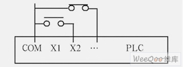 对于工业现场中经常会用到的开关、按钮等开关量信号,通常按照图1的配线方法接入plc的输入点,该方法以com端作为所有开关量输入信号的公共端,每一个开关或按钮接入一个plc的输入点。