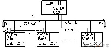 多个CAN节点通过传输介质按一定的形式互连,就可以组成CAN通信网络。与RS-485总线类似,CAN总线只支持总线型网络拓扑结构,不支持环形或星型网络。CAN总线通信只用到两根导线CAN_H、CAN_L,对通信介质的要求较低,双绞线、同轴电缆或光纤均可,通常采用廉价的双绞线即可。由集中器节点组成的CAN总线分布式测控网络结构如图2所示。